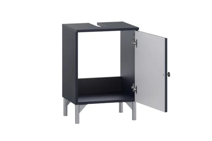 Eine Tür mit frei wählbarem Anschlag schützt den Innenraum vor Spritzwasser und Schmutz. Hier lassen sich Putzmittel, Pflegeprodukte oder Handtücher ordentlich verstauen. Ein hochwertiger Griff und Beschläge aus Metall unterstreichen das zeitlose Design. Der Siphonausschnitt ermöglicht die problemlose Integration unter dem Waschbecken und die stabilen, nickelmatt lackierten Kunststofffüße sorgen für sicheren Stand. Dank der kompakten Maße eignet sich der Bad-Waschbeckenunterschrank JESPER perfekt für kleine Bäder oder Gästetoiletten.