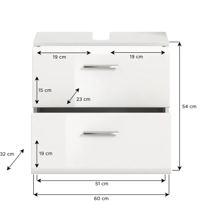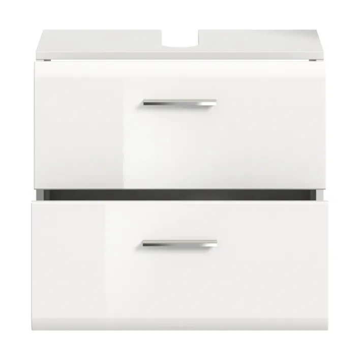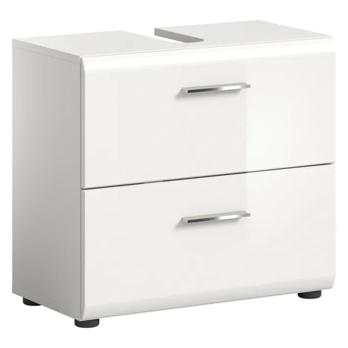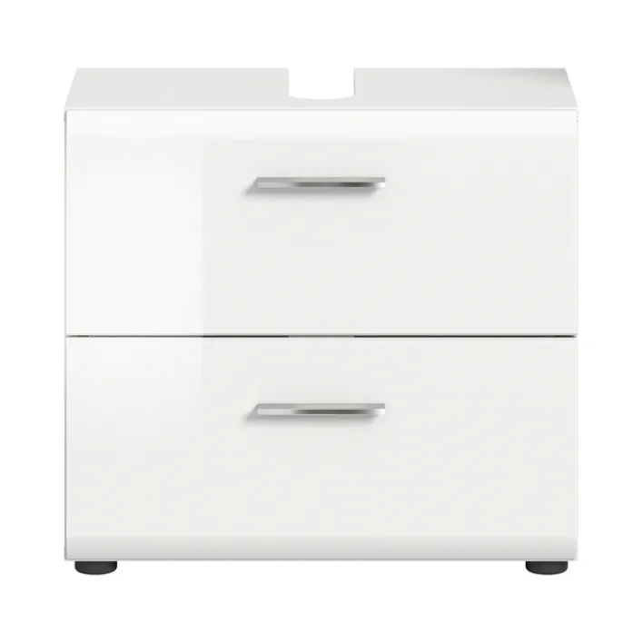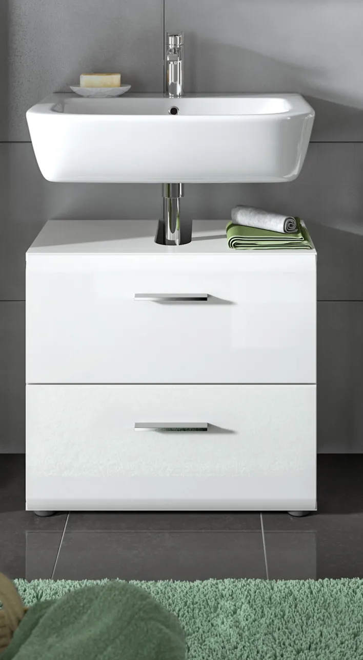 Der praktische Bad-Waschbeckenunterschrank LOGAN überzeugt mit seinen glänzenden weißen Oberflächen. Er bietet Platz für alles, was griffbereit unter dem Waschbecken sein soll. Waschbeckenunterschränke erfüllen zwei wichtige Aufgaben. Zum einen verdecken sie das Abflussrohr und sorgen für ein schönes Badambiente. Zum anderen stellen sie eine wichtige Aufbewahrungsmöglichkeit dar. Der Bad-Waschbeckenunterschrank LOGAN aus Holznachbildung ist mit zwei Schubkästen ausgestattet. Sie lassen sich bequem mit den silberfarbigen Griffleisten aus Kunststoff öffnen. Mit einem Handgriff sind Handtücher, Utensilien oder Produkte für die Haut- und Haarpflege erreichbar. Ein Waschbeckenunterschrank ist ein wichtiges Möbelstück für kleine Bäder, da er den Platz unter dem Waschbecken optimal nutzt.