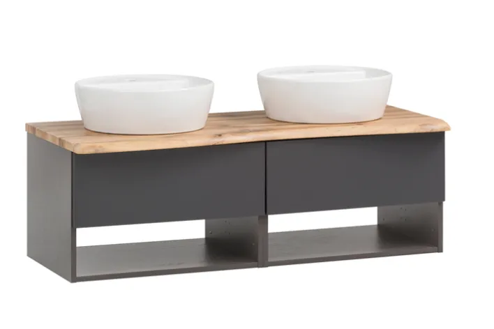 Der Bad-Waschtisch ANTWERPEN ist 121 cm breit, 54,5 cm hoch und 47 cm tief. Er ist aus Holznachbildung in Matt-Grau und Graphit und verfügt über 2 Keramikbecken.