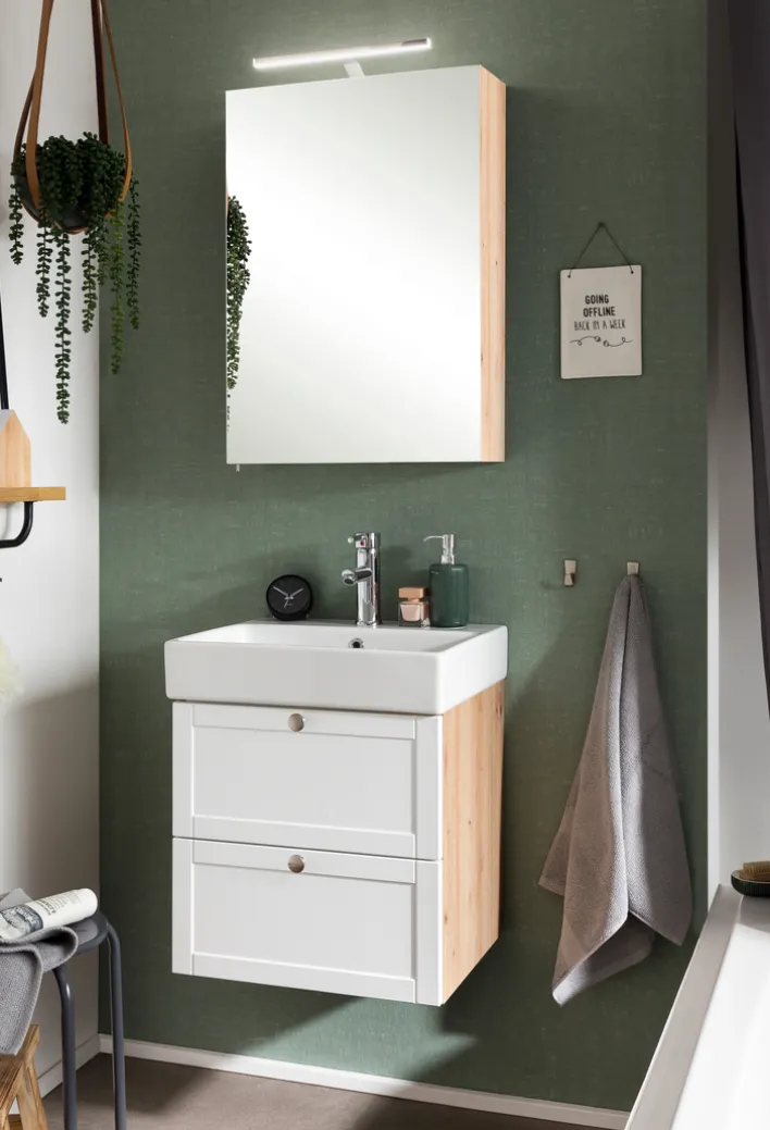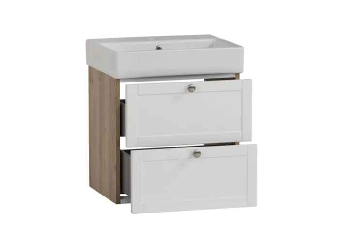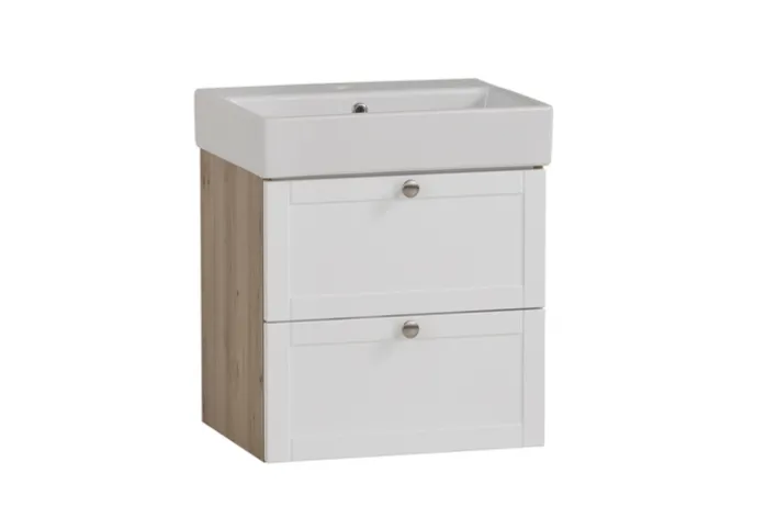 Auf 57 x 50 x 40 cm bietet der Bad-Waschtisch JESPER weiß im Landhausstil mit braunem Korpus Stauraum in zwei Schubkästen sowie Waschplatz mit einem rechteckigen Aufsatz-Waschbecken. Das Modell wiegt mit aller Ausstattung 28 kg.