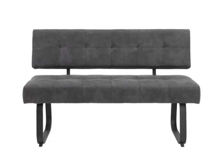Mit einer Sitzhöhe von 48 cm ist die Bank LUISE als Sitzgelegenheit am Esstisch hervorragend geeignet. In Kombination mit anderen Polstermöbeln kann sie auch als Blickfang im Wohnzimmer dienen. Freistehend kommt das Kufengestell aus dunklem Metall besonders gut zur Geltung.