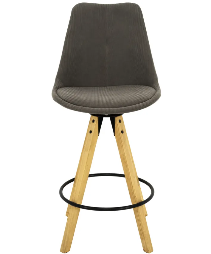 Der TURA Barhocker aus massivem Gummiholz kombiniert ein natürliches Vierfußgestell in hellbraunen Eichefarben mit einer grauen Sitzfläche – die dank ihrer minimalistischen Formsprache eine wunderbar leichte Raumwirkung entfaltet. Ein weiterer Hingucker ist das schwarze, runde, das Fußgestell umschließende Element, das als Fußablage zugleich noch einen praktischen Zweck erfüllt.