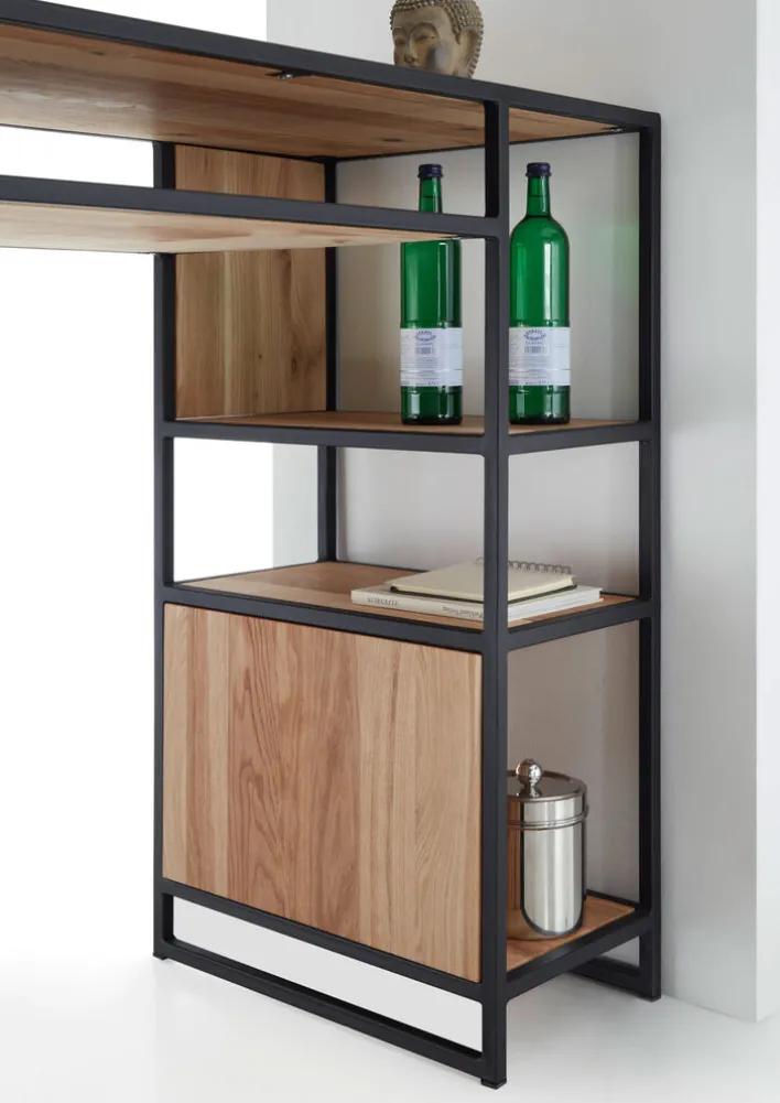 Der moderne Bartisch LOGAN Massiv vereint das matt schwarz lackierte Metallgestell mit Ablagen und Seitenwänden aus massivem Eichenholz. Mit seinem extravaganten Design harmoniert der Bartisch perfekt mit Möbeln im Industrie Stil, kann aber auch mit modernen Möbeln in Eiche kombiniert werden. Auf den vier Ablagen bietet der Bartisch ausreichend Platz für Flaschen, Gläser und Utensilien zum Mixen von Cocktails. Die geräumige Tischplatte ist wiederum die ideale Basis zur Zubereitung von köstlichen Getränken für Familie und Gäste.