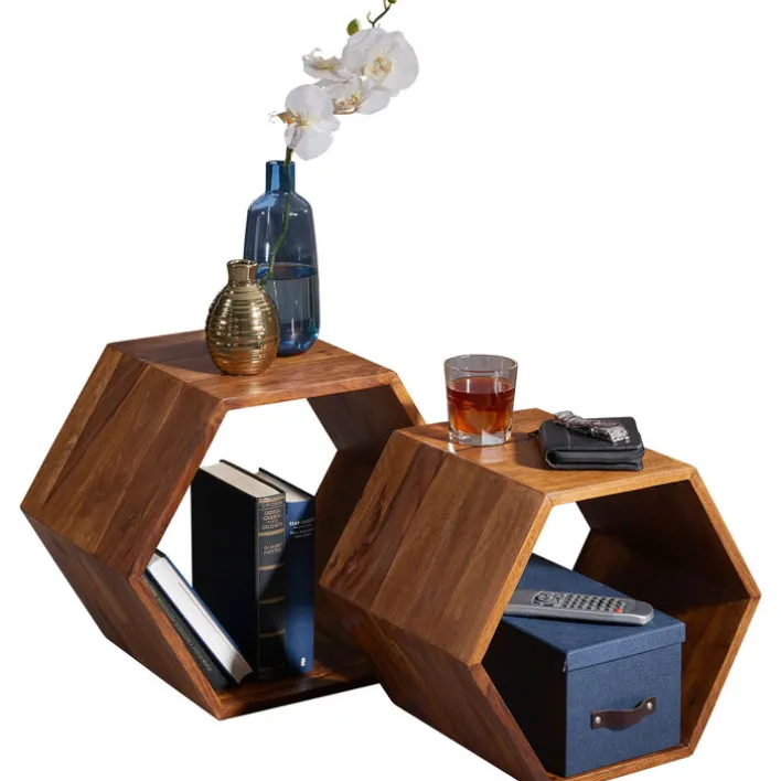 Die sechseckigen Beistelltische in der Form einer Honigwabe kommen in zwei Größen in den Wohnraum. Dank der Verwendung von massivem Sheeshamholz sind sie robust und lassen sich mit einem Gewicht von maximal 5 kg belasten. Das Holz ist in Honigfarbe gebeizt und strahlt dadurch Wärme und Natürlichkeit aus. Dadurch erhält auch der Wohnraum ein gemütliches Ambiente. Zusätzlich zum spannenden Design überzeugen die Beistelltische mit je zwei kleinen Ablagen.