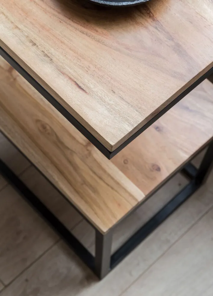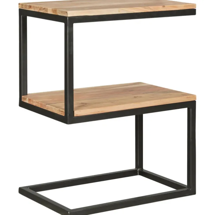 Die raffinierte S-Form und das moderne Industrial Design verleihen dem Beistelltisch eine ansprechende Optik. Das matt schwarze Gestell aus pulverbeschichtetem Eisen sorgt für eine hohe Stabilität und ergänzt sich optimal mit dem hellen Braun der beiden Tischplatten. Diese bestehen aus massivem Akazienholz und bieten ausreichend Platz für spannende Lektüre, Snacks, Getränke oder die Fernbedienung. Nicht nur im Wohnzimmer macht der 60 cm hohe Tisch eine gute Figur, auch als origineller Nachttisch oder praktische Ablage im Flur eignet er sich hervorragend.