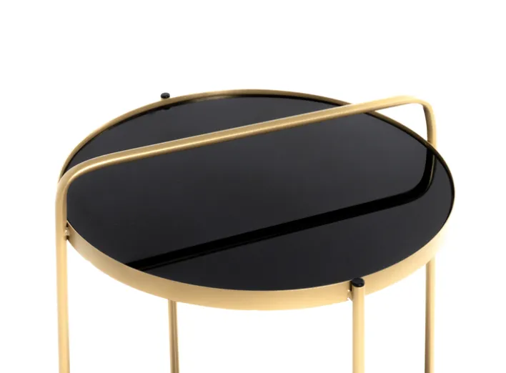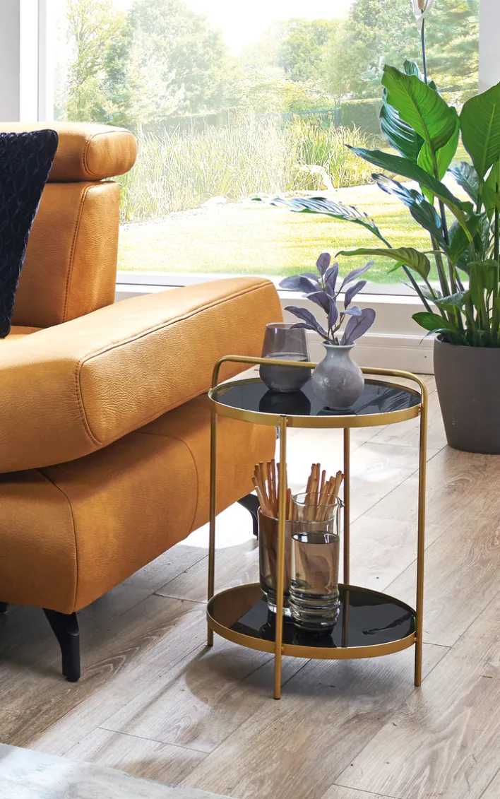 Der 38 x 38 cm schwarz-goldfarbige Beistelltisch kombiniert eine moderne runde Formsprache mit einem Spiel aus Kontrasten: Die goldfarbig schimmernden Rahmen- und Randflächen treffen auf tiefschwarz eingefärbtes Sicherheitsglas. So erhält der Beistelltisch nicht nur einen unverkennbaren Glamour-Effekt, sondern ist aufgrund der zwei übereinanderliegenden Tischplatten auch ganz flexibel nutzbar.