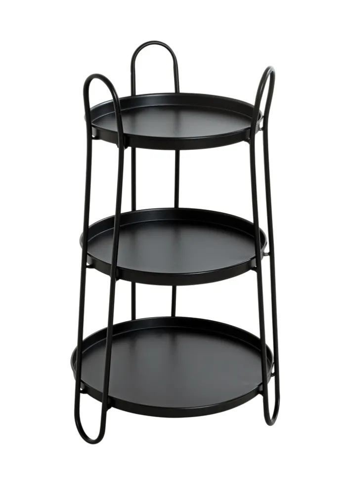 Der schwarze 43 x 43 cm große Beistelltisch ähnelt optisch einer Etagere, die den Möbeldesignern hier auch zweifelsfrei als Vorbild und Quell der Inspiration diente. Drei einzelne Ablageflächen sind bei dem Beistelltisch auf kunstvolle und lebhafte Weise miteinander verbunden – und bieten nach unten hin immer ein wenig mehr Platz.
