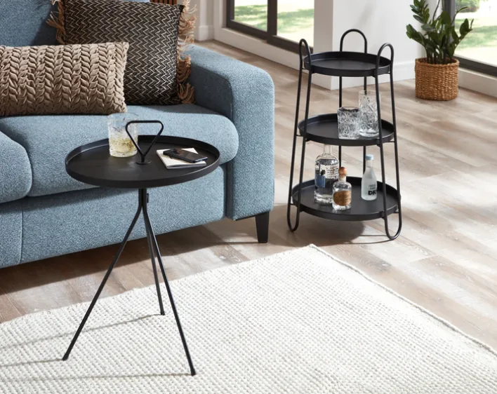Ein weiteres Highlight ist die Konstruktion vom Beistelltisch in Schwarz, denn der Rahmen, der die Ablageflächen verbindet, geht nahtlos in die Standfüße über. So entsteht ein ganzheitliches Möbeldesign, das zugleich für die nötige Robustheit sorgt. Das schwarz lackierte Metall besticht mit seiner optisch dezent wirkenden Materialoberfläche, die Ablagen haben zudem einen etwas erhöhten Rahmen.