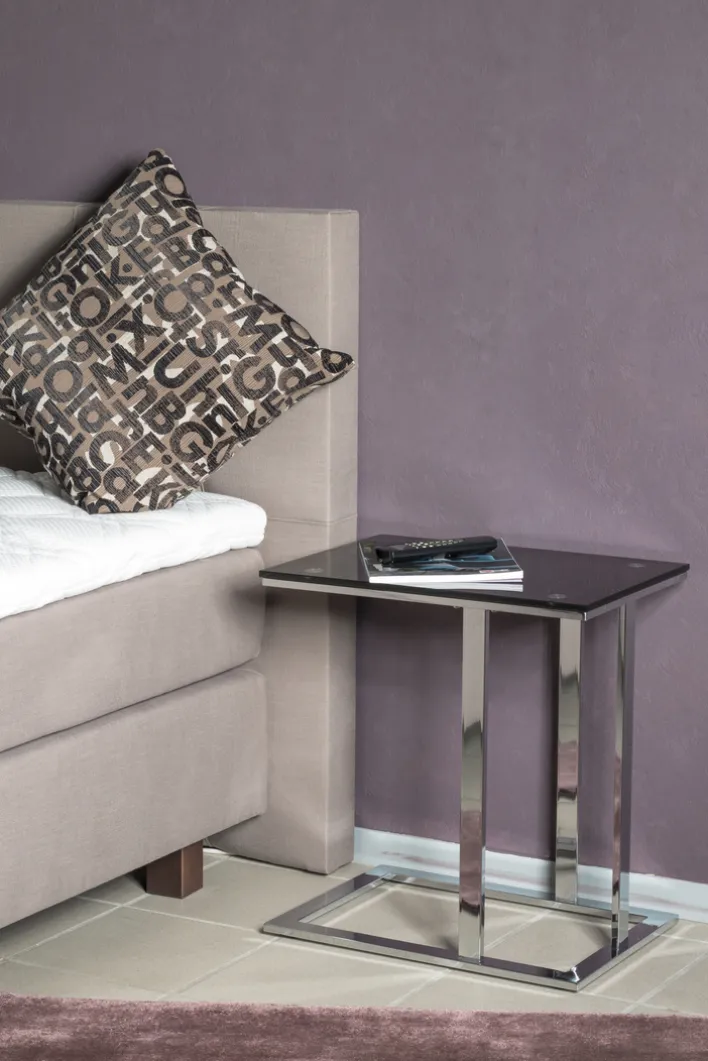 Der 54 x 37 cm große Beistelltisch strahlt mit der Kombination aus Chromfarbig / Schwarz moderne Eleganz aus. Punkten kann der Tisch außerdem mit einem Gestell, das sich besonders nah an Couch und Sessel heranziehen lässt.