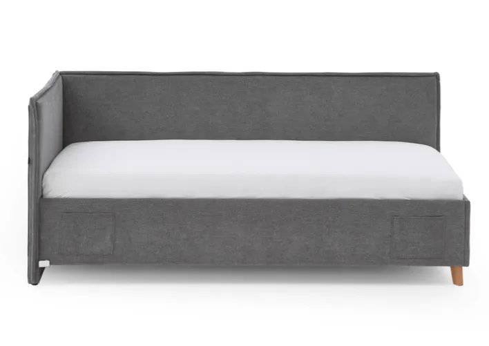 Das Bett FUN, graufarbig mit einer Liegefläche von 90 x 200 cm, besteht aus hochwertigem Polyester. Die braunfarbigen Füße sind aus Eichenholz gefertigt. Das Kinder- bzw. Jugendbett lässt sich aufgrund der Seitenhöhe von 42 cm schnell in ein Sofa umfunktionieren.