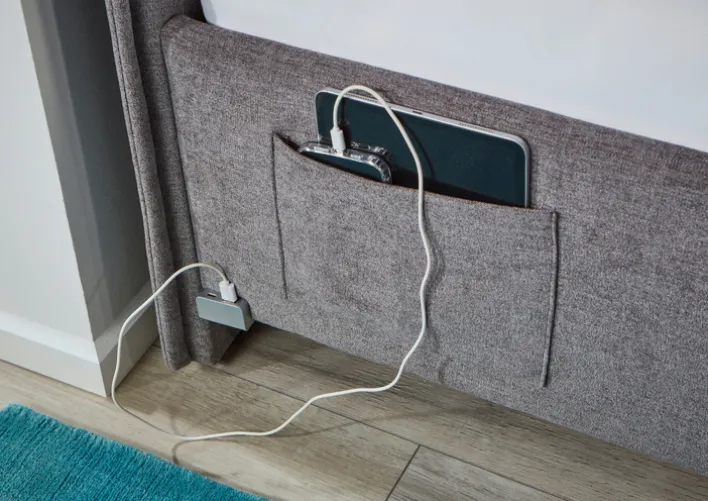 Obwohl es hauptsächlich für das Jugendzimmer konzipiert ist, eignet sich das Bett FUN ebenso gut als Singlebett für Erwachsene. Es lässt sich hochklappen, und der Bettkasten bietet optimalen Stauraum, wodurch im Zimmer schnell Ordnung herrscht. Das Kopfteil hat eine Höhe von 90 cm, was das bequeme Sitzen und Lesen unterstützt. Zusätzlich gibt es zwei seitliche Taschen für Handy oder Tablet, die über Nacht mithilfe der integrierten USB-Anschlüsse aufgeladen werden können.