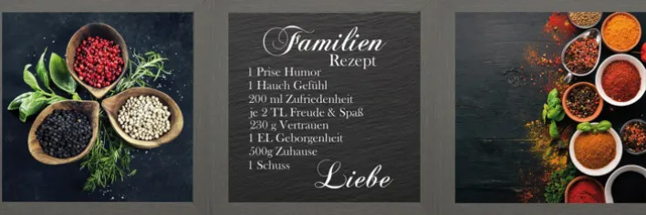Das Kunstdruck-Set „FAMILIENREZEPT“ von Bönninghoff ist eine stilvolle Ergänzung für jedes Zuhause. Es besteht aus drei rechteckigen Bildern, die jeweils 23 cm breit und hoch sowie 2,1 cm tief sind. Die Hauptfarbe des Sets ist mehrfarbig, was durch die lebendigen Darstellungen von Gewürzen und Kräutern auf den äußeren Bildern unterstrichen wird. Diese Bilder zeigen eine Vielzahl von Gewürzen in natürlichen Holzbögen und Schalen, die auf einem dunklen Hintergrund arrangiert sind, was den modernen und eleganten Stil des Sets betont.