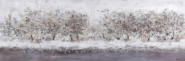 Das Wandbild aus der Serie BÄUME zeigt eine stilisierte Baumlandschaft in mehrfarbigen, überwiegend beigen und braunen Tönen. Die Darstellung wirkt durch die handgearbeitete Technik und die Struktur der Leinwandoberfläche lebendig und einzigartig. Die rechteckige Form mit den Maßen 120 cm Höhe und 40 cm Breite bietet ein großzügiges Format für den Innenbereich.