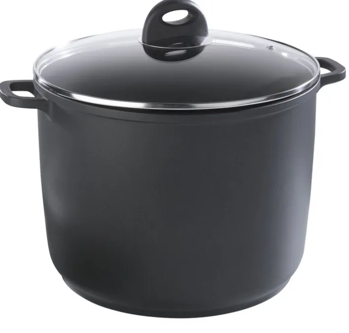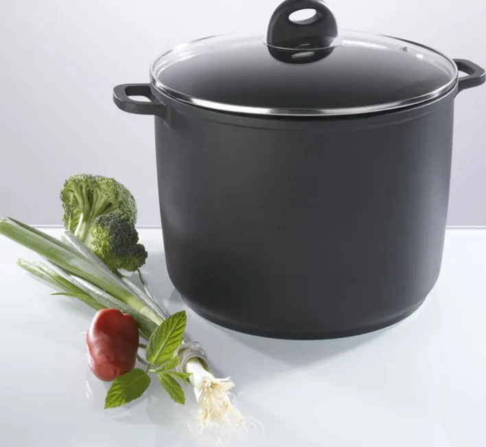 Der matt schwarze bongusto Gemüsetopf besteht aus hochwertigem Aluguss und kommt gemeinsam mit dem passenden Deckel in die Küche. Mit einem Fassungsvermögen von 11 Liter ist der Topf ideal für Familien geeignet. Der Deckel lässt mit seinem Glassichtfenster jederzeit einen Blick auf den Topfinhalt zu, während der Kunststoffgriff mit Griffloch ein unkompliziertes Handling ermöglicht. Verwendbar ist der große Gemüsetopf auf allen Herdarten, auch bei Induktion.