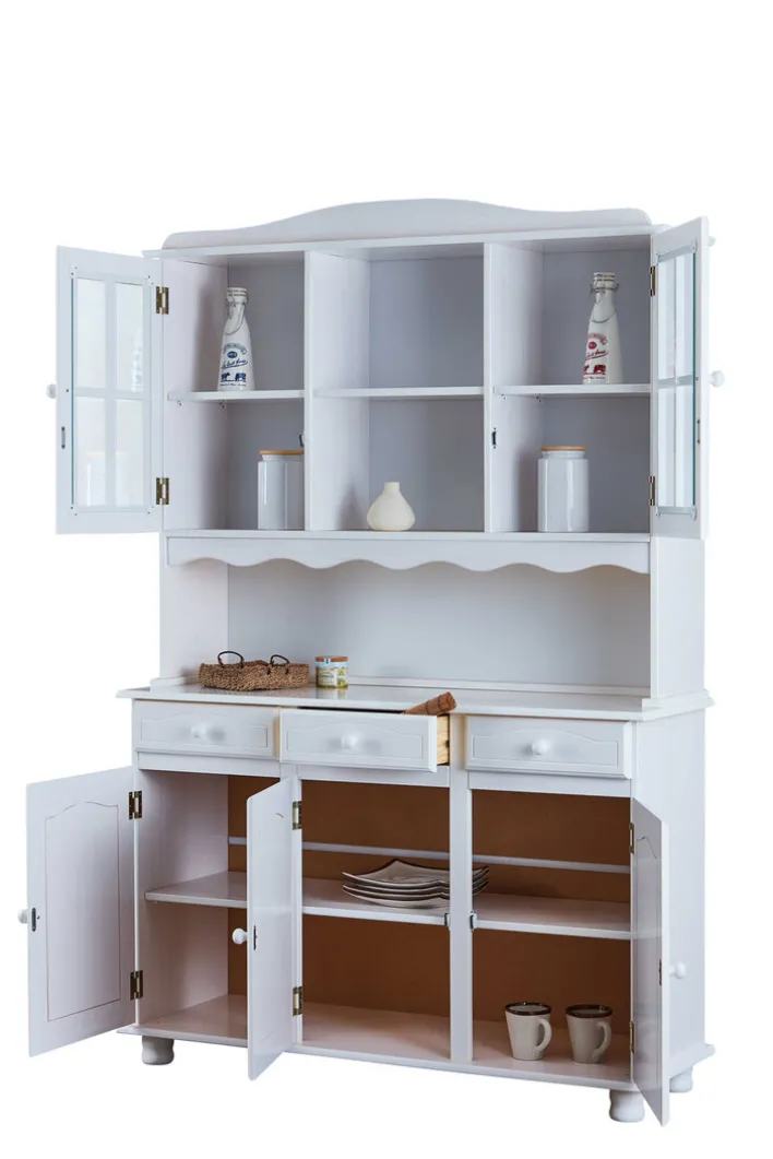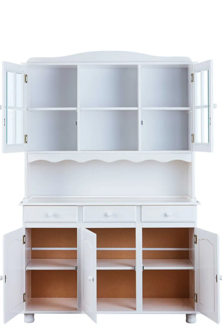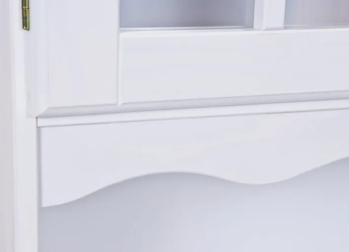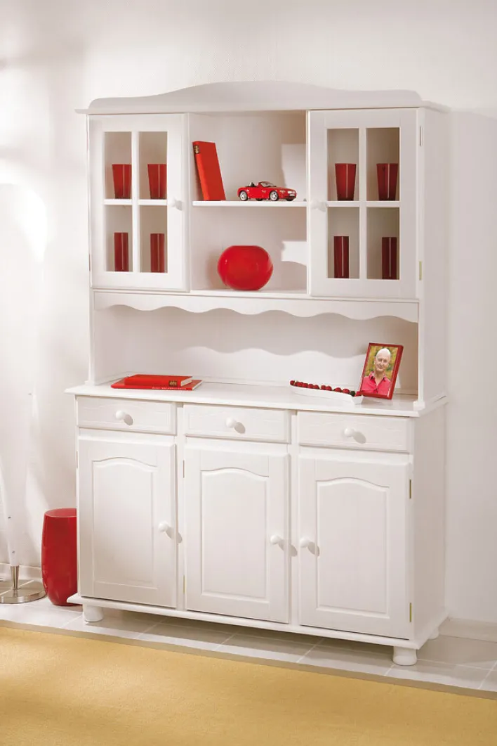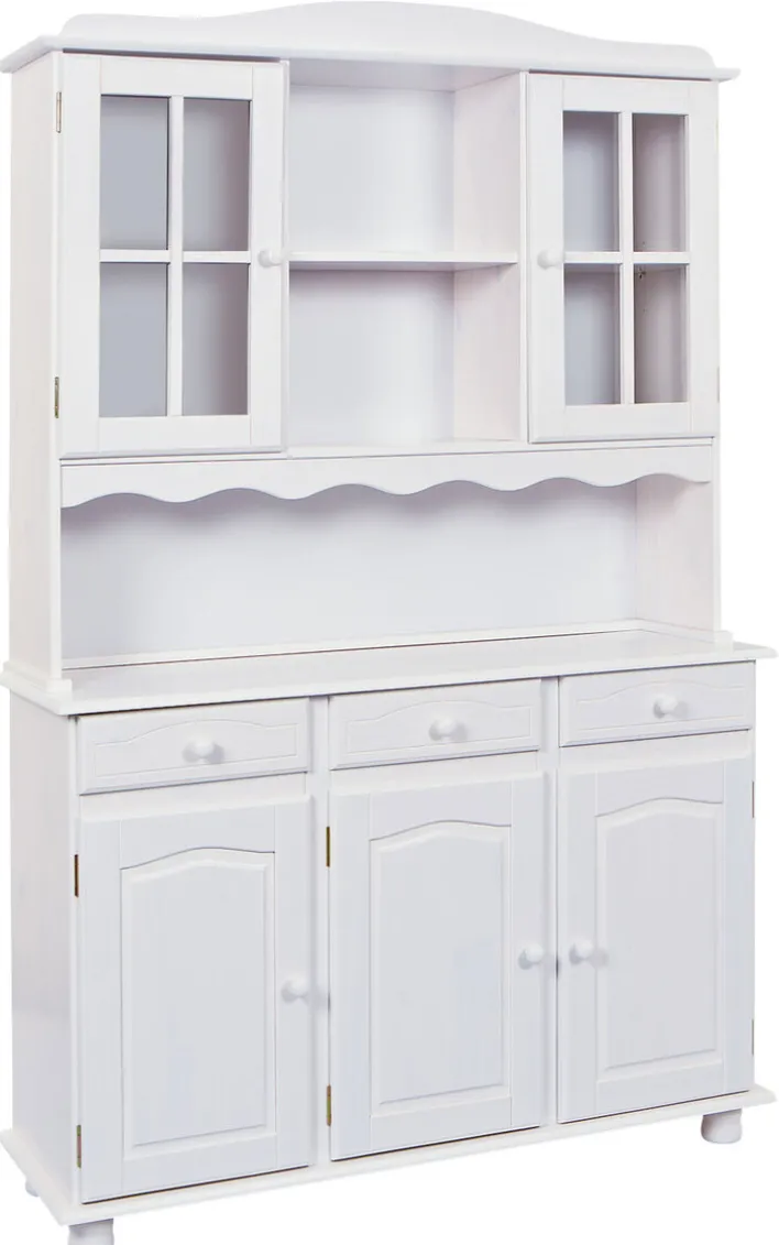 Als Möbelstück für Küchen und Wohnzimmer verbindet der weiße Buffetschrank FELIX Zweckmäßigkeit mit Nostalgie. Sein Korpus besteht aus Kiefernholz. Die Türen sind mit einem Einsatz aus transparentem Glas versehen. In dem eleganten Schrank lassen sich Teller, Tassen oder Gläser verstauen. Die drei Schubkästen sind eine praktische Aufbewahrungsmöglichkeit für Besteck oder Küchengeräte.