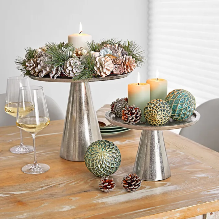 Die silberfarbige Deko-Platte mit Sockel ist aus Aluminium gefertigt und hat einen Durchmesser von 27 cm. Eine ungewöhnliche Oberflächenstruktur verleiht dem exklusiven Design einen eleganten Vintage-Charme.