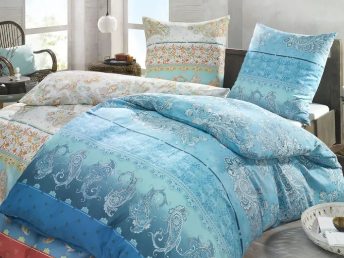 Die Bettwäsche SUN von casaNOVA in der Größe 135 x 200 cm besteht aus Satin. Sie überzeugt durch ihr elegantes Design in verschiedenen Blautönen, das florale Motive mit dem beliebten Paisley-Muster kombiniert.