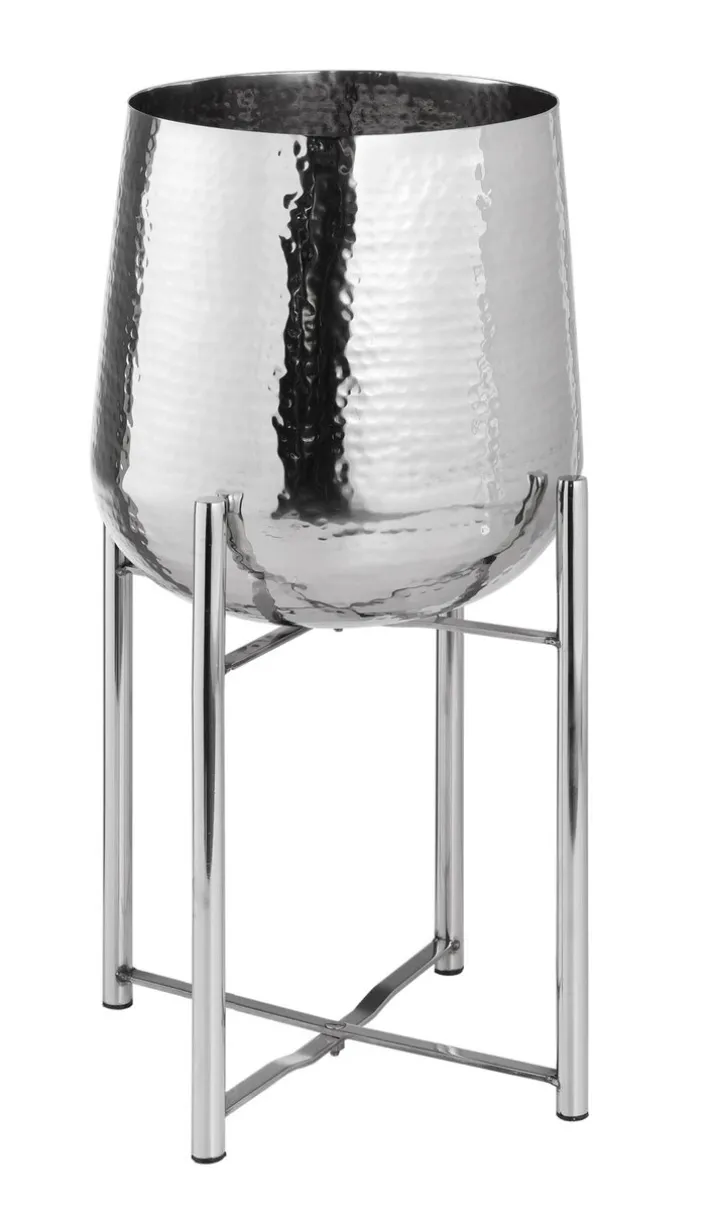 Der moderne Blumentopf aus Stahl hat einen Durchmesser von 23,5 cm. Er lässt sich das ganze Jahr über einsetzen, sieht jedoch besonders zu Weihnachten sehr festlich aus, z. B in Kombination mit einem schönen Weihnachtsstern. Der Topf verfügt über ein stabiles Stahlgestell auf 4 Füßen und hat dabei selbst eine konisch-runde Form mit markantem Hammerschlag-Design. Er ist pflegeleicht, rostfrei und dadurch besonders lange einsetzbar.