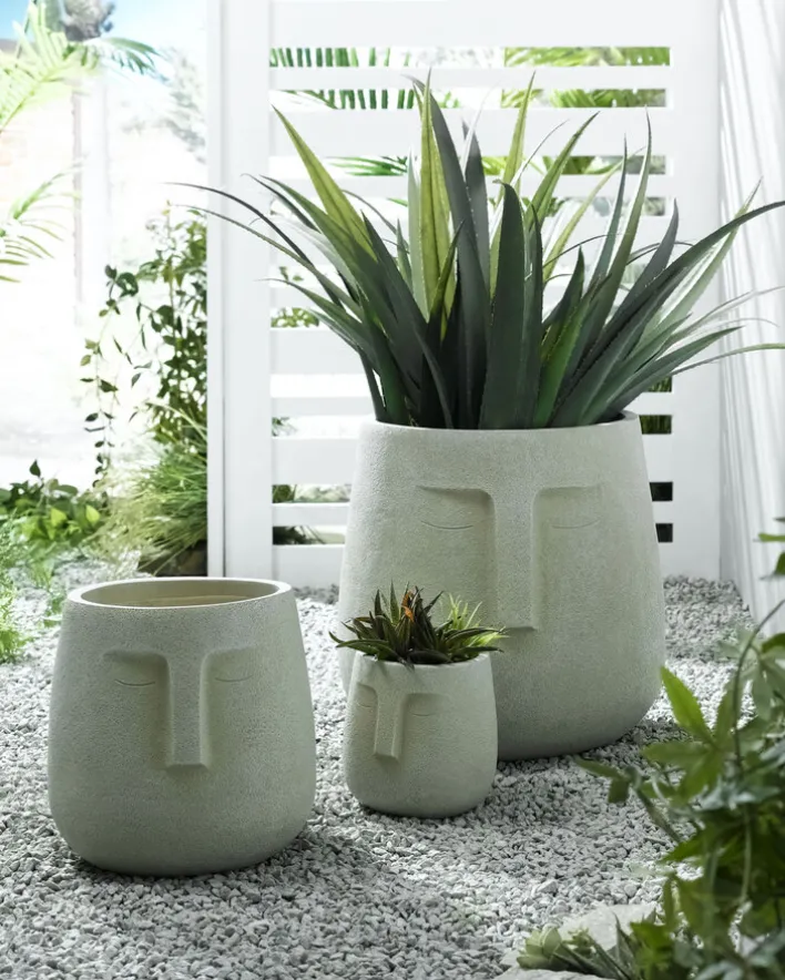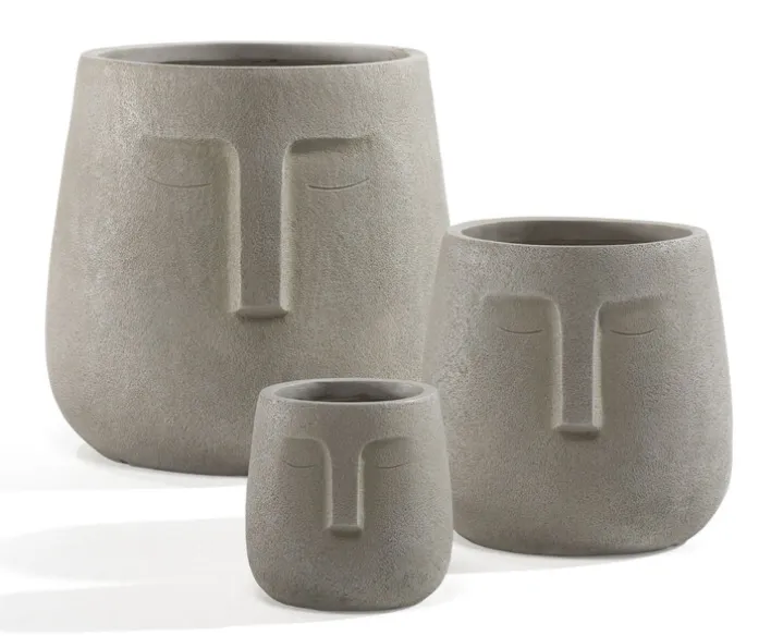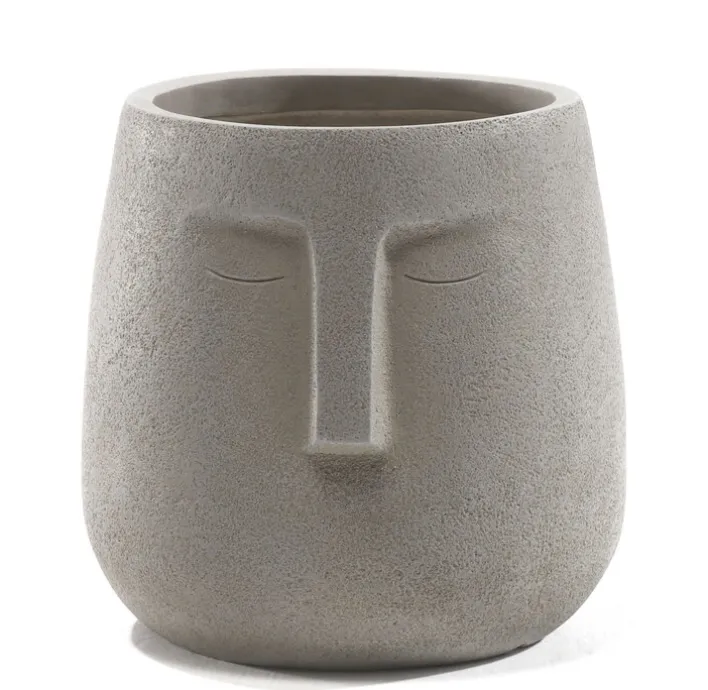Der Umtopf besteht aus dem Kunststein Magnesia sowie Fiberglas (Glasfaser). Sein stark stilisiertes Gesicht zeigt geschlossene Augen und eine stark ausgeprägte Nasenpartie. Durch die geschlossenen Lider wird viel Ruhe in den Raum gebracht. Auch die helle Farbe begeistert. Sie kontrastiert bunte Blumen und Grünpflanzen gleichermaßen auf sehr harmonische Weise. Zudem passt sie in zahlreiche helle wie auch als Kontrapunkt in dunklere Interieurs. Der Übertopf eignet sich für Wohnräume.