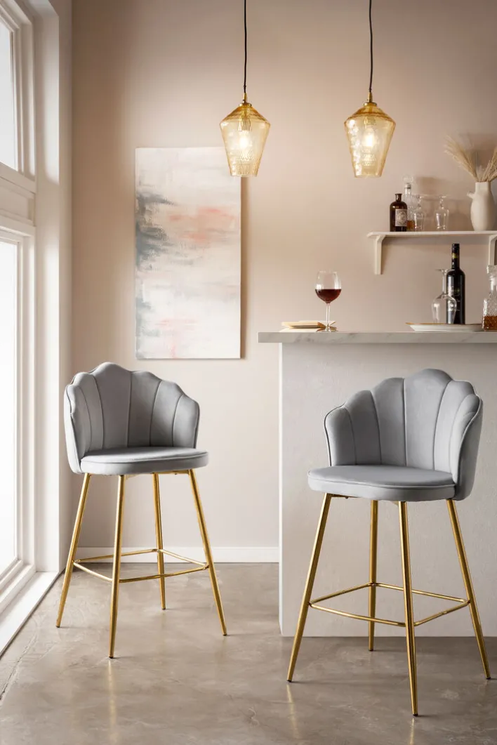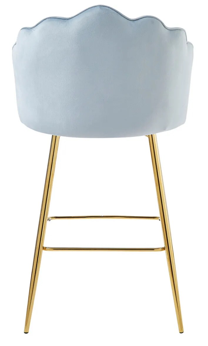 Der CASAVANTI Barhocker hat eine Größe von 53 x 100 x 54 cm und kombiniert das stabile, goldfarbige Metallgestell mit einem fest gepolsterten Sitz mit halbhoher Rückenlehne in Muschelform. Dank hellgrauem Samtbezug bietet der Barstuhl eine angenehme Haptik. Die Fußbank sorgt gemeinsam mit dem gepolsterten Sitz für einen hohen Sitzkomfort. Mit seinem stilvollen Look harmoniert der Barhocker mit modernen und klassischen Einrichtungsstilen und bringt einen Hauch von Eleganz in die eigene Hausbar.