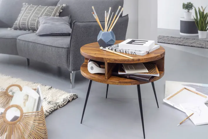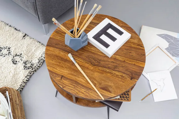 Der runde CASAVANTI Couchtisch mit einem Durchmesser von 60,0 cm ist aus massivem Sheesham-Holz gefertigt. Die Höhe des Tisches beträgt 45,0 cm. Mit dieser kompakten Bauform und einer modern gestalteten Optik kann der Couchtisch viele Einrichtungsstile im Wohnbereich ergänzen. Die Tischbeine bestehen aus einem pulverbeschichteten Vierfußgestell mit leichter Schräge. Angefertigt aus Schmiedeeisen sind diese in schwarzer Farbe matt lackiert.