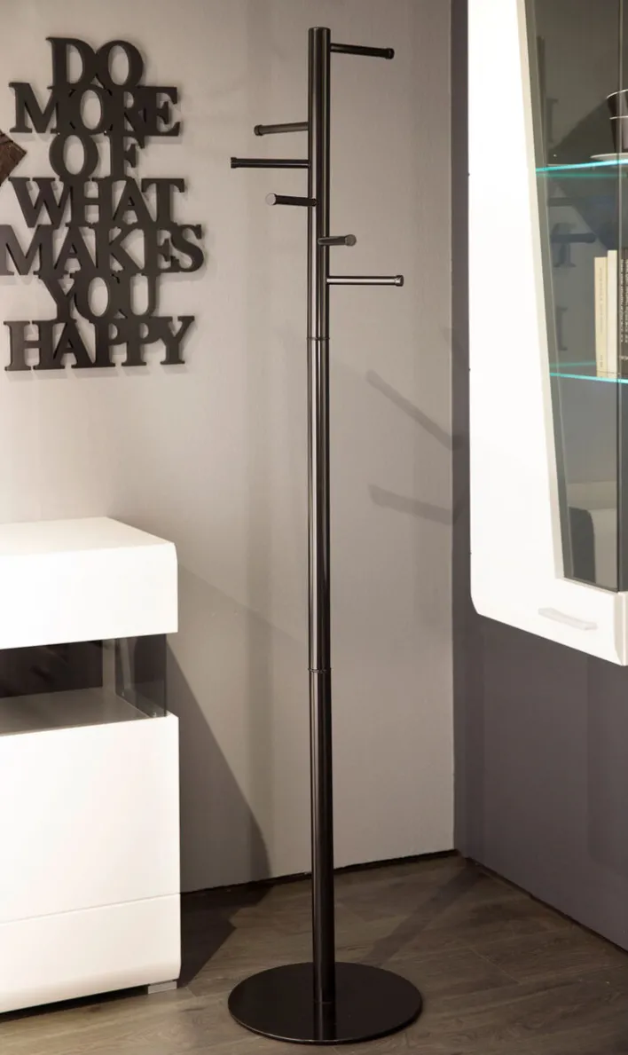 Der Kleiderständer EUGEN schwarz von CASAVANTI hat einen schweren Standfuß mit 35 cm Durchmesser, der den Ständer stabil hält. Hemden, Pullover, Schals, sogar schwere Mäntel halten die spiralförmig angeordneten Haken. Das schlichte Design wirkt im Zusammenspiel mit der schwarzen Pulverbeschichtung elegant und modern. Der Kleiderständer von CASAVANTI passt sowohl in rustikal eingerichtete Garderoben als auch in moderne Jugendzimmer und Schlafräume. Das ist kein stilistisch eindeutig festgelegtes Möbelstück, sondern ein dezenter Alleskönner!