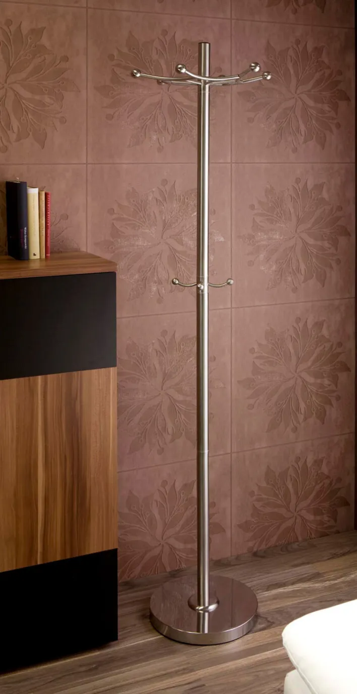 Der Kleiderständer MARCEL aus dem Hause CASAVANTI ist auch für kleine Flure geeignet. Er beansprucht wenig Platz. Zudem kann er eine Ergänzung zu den vorhandenen Garderobenmöbeln sein und genutzt werden, wenn Gäste kommen. Im Schlafzimmer oder in der Ankleide macht er ebenfalls eine gute Figur. Der silberfarbige Kleiderständer aus gebürstetem Edelstahl ist sehr dekorativ. Am oberen Kranz befinden sich 6 Haken für Jacken, Mäntel und Schals. Am unteren Kranz, der über 4 Haken verfügt, lassen sich zum Beispiel die Taschen aufhängen.