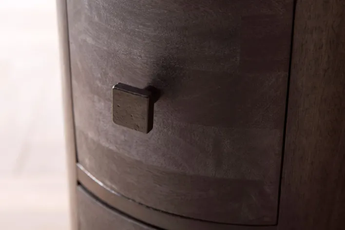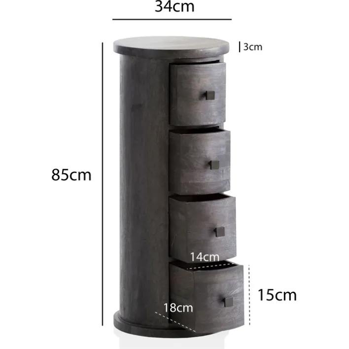 Die elegante Kommode von CASAVANTI hat die Maße 34 x 85 cm und passt in den modern oder klassisch eingerichteten Wohnbereich. Durch die zylindrische Form ist die Kommode aus Mango Massivholz in der Farbe Schwarz ein Blickfang für Wohn-, Ess- oder Schlafzimmer. Vier kleine Schubkästen bieten Platz für Kleinteile, Schmuck oder Accessoires. Die runde Oberplatte ist der ideale Platz für eine dekorative Figur, Statue oder einen Blumentopf. Die Kommode sorgt für ein wohnliches Ambiente.