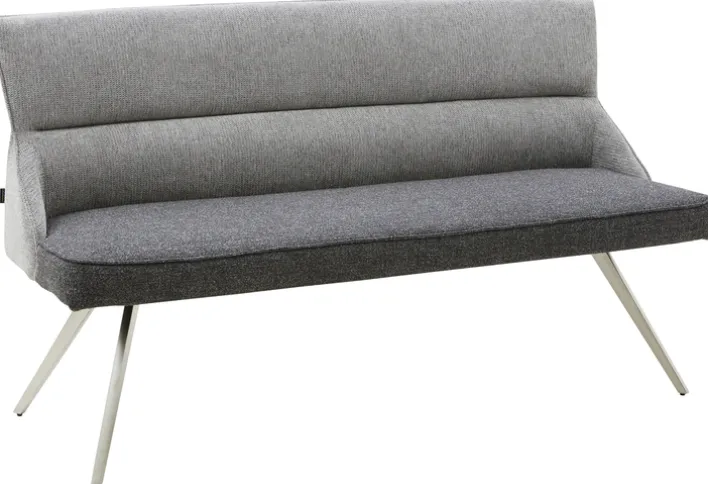 Die CASAVANTI Sitzbank TAIGA ist 160 cm breit, 92 cm hoch und 63 cm tief. Der Bezug ist aus grauem Textilmaterial. Das Vierfußgestell ist aus gebürstetem Edelstahl.
