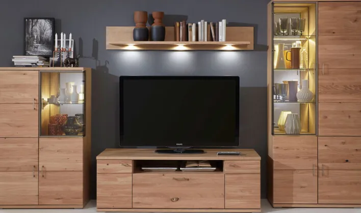 Die Wand besitzt ein offenes Fach (im Lowboard) und zehn Drehtüren. So haben Sie reichlich Platz für Elektronik, dekorative Objekte und weitere Kleinigkeiten. Manches ist hinter einer Tür einfach am besten aufgehoben und aufgeräumt. Für die Vitrinen sind Spiegelglas und Parsolglas eingesetzt. Mit der Beleuchtung bekommen die Vitrinen eine besondere Optik. Die fest eingebauten LEDs der Glaskanten-Rückwandbeleuchtung besitzen die Energieeffizienzklassen A bis A+++. Die Alteiche zeigt eine schöne Maserung und die Farbe passt zu sehr vielen Wohnzimmereinrichtungen.