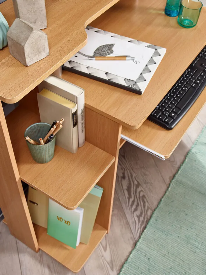 Der Computertisch besteht aus solider Holznachbildung in Buche-Dekor. Neben der geräumigen Tischplatte bietet er drei offene Ablagen sowie einen schmalen Schreibtischaufbau, der ideal für Monitor, Stifte und Dekorationen geeignet ist. Unter der Tischplatte befindet sich zudem ein Tastaturauszug. Dadurch bleibt die Oberfläche des Tisches für Arbeitsunterlagen frei. Mit seinem freundlichen Braunton harmoniert der Computertisch mit vielen Möbeln in Bucheoptik und sorgt zugleich für eine gemütliche Atmosphäre im Homeoffice.