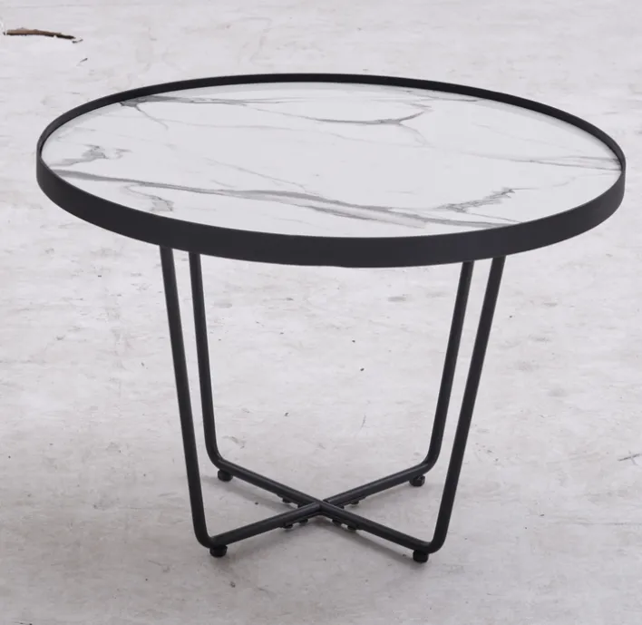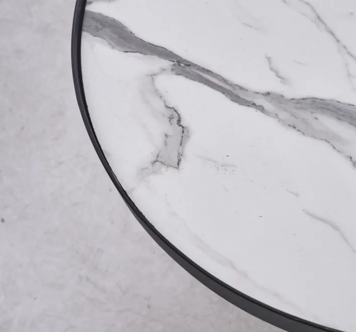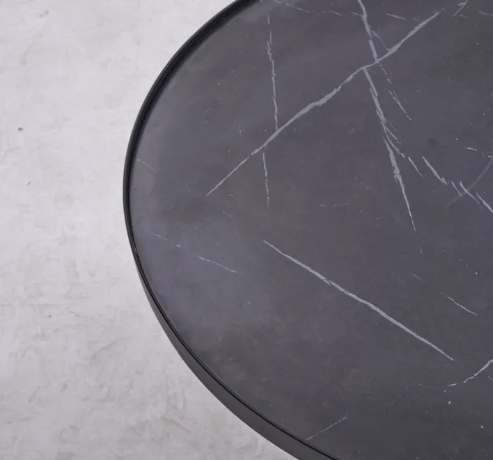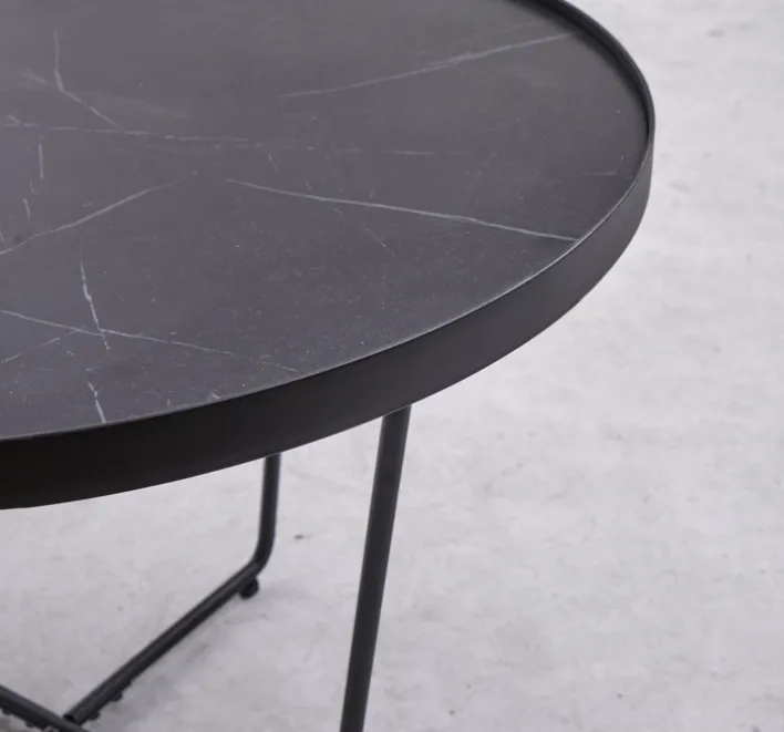 Die Tischplatten sind in einer ansprechenden Steinoptik gehalten, wobei der größere Tisch in Schwarz und der kleinere in einer Schwarz-Weiß-Marmoroptik gestaltet ist. Diese kontrastreiche Farbgebung verleiht dem Set eine besondere visuelle Dynamik. Die lackierte Oberfläche sorgt für eine pflegeleichte Handhabung und unterstreicht die hochwertige Verarbeitung. Das Fußkreuz aus Metall bietet nicht nur Stabilität, sondern auch einen modernen Akzent, der sich harmonisch in verschiedene Wohnstile einfügt. Mit einem Gesamtgewicht von 8,30 kg ist das Set leicht zu bewegen und flexibel einsetzbar.
