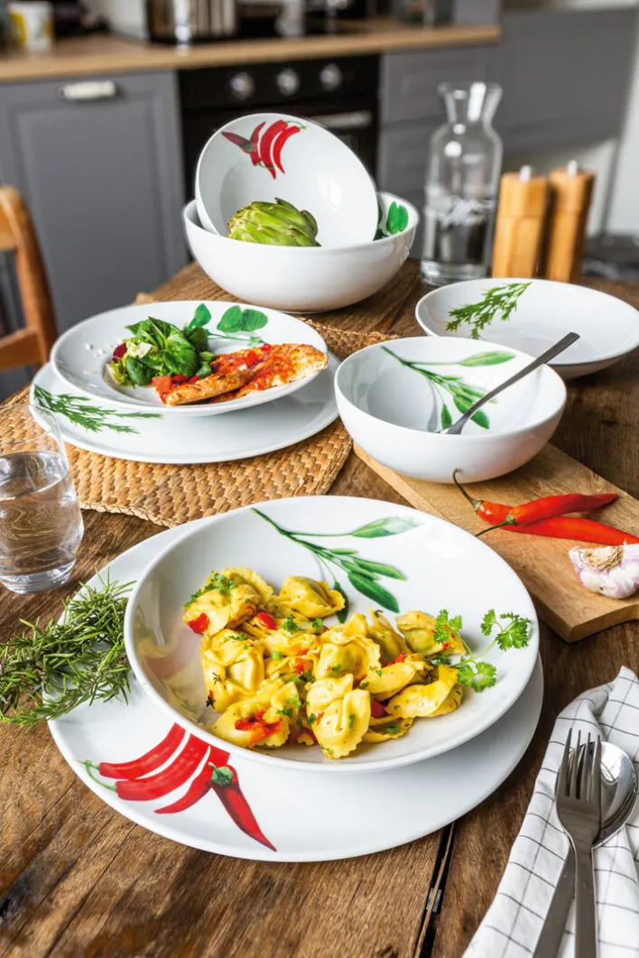 Möchten Sie Ihre Gäste mit italienischer Küche verwöhnen, servieren Sie Ihre Kreationen auf dem CreaTable Pastateller KRÄUTER SALBEI. Den Rand des tiefen Tellers ziert ein grüner Salbeizweig. Das frische Design macht Lust auf Pasta mit Kräutern, knackige Salate oder leckere Suppen. Auch für Gnocchi mit Salbeibutter, ein typisch italienisches Gericht, eignet sich der Teller optimal. Die hochwertige Keramik ist mikrowellenfest und zeichnet sich durch einen edlen Glanz aus. Für eine kreative Tischdeko kombinieren Sie den Pastateller KRÄUTER SALBEI mit weiteren Tellern von CreaTable.