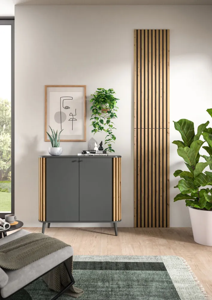 Zum Dekopaneel 2er-Set 40 x 120 cm Artisan-Dekor gehören zwei schallschluckende Wandverkleidung in Eiche-Nachbildung sowie eine Abschlussleiste. In einer Tiefe von zwei cm wird Lärm in Innenräumen deutlich gedämpft.