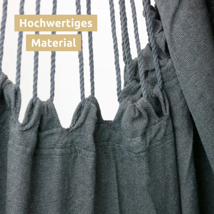 Der Hängesessel und die diversen Zubehörteile sind aus einem hochwertigen Textil gefertigt und aufwendig vernäht. Das unifarbige Textil ist gefärbt. Die Hakenaufhängung des Sessels besteht aus massivem Holz. Der Hängesessel für den Innen- und Außenbereich ist bis zu 120 kg belastbar.