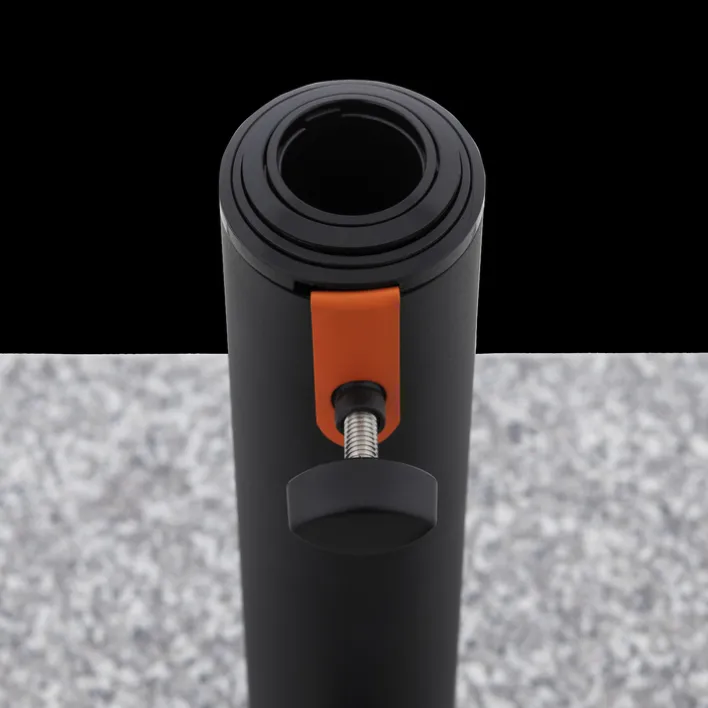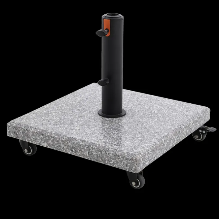Der doppler Sonnenschirmständer myZONE aus Granit, Edelstahl und Kunststoff ist 45 cm breit und 45 cm tief. Er ist insgesamt 43,5 cm hoch und verfügt über 4 feststellbare Rollen und unterschiedliche Reduziereinsätze für verschiedene Schirmmodelle.