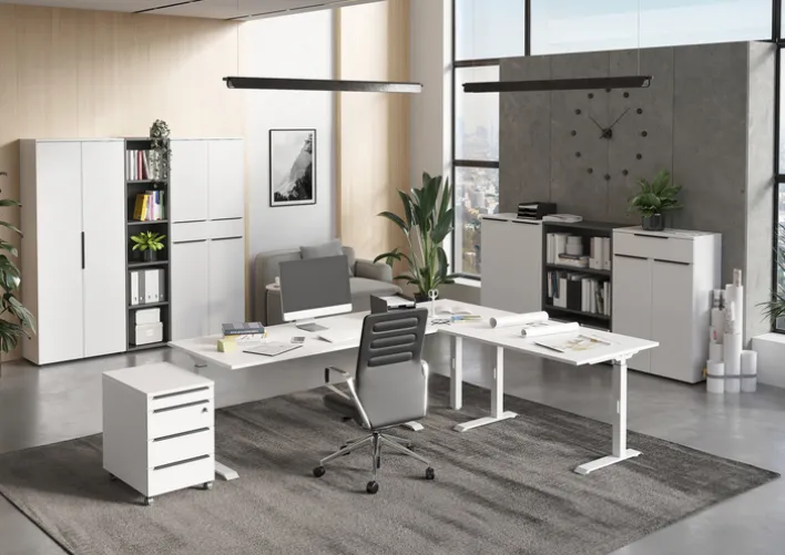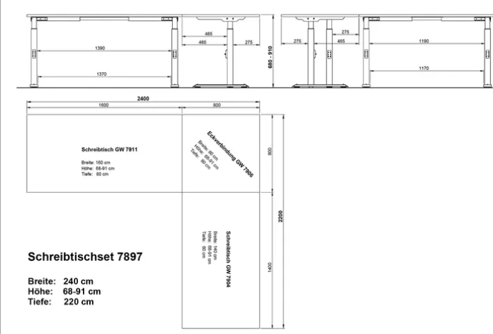 Der in jeder Ecke des Raum perfekt passende Arbeitstisch besteht aus einer Tischplatte aus Spanplatte, die mit Melaminharz beschichtet ist. Das über Eck verlaufende Modell Made in Germany, das auch in der Mitte von großen Räumen gut aussieht, ist mit ABS-Kanten versehen. Das T-Gestell ist aus robustem Metall gefertigt. Die Höhe der Tischplatte wird mechanisch nach Bedarf verstellt.