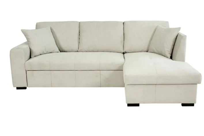Das Ecksofa HOLDEN bietet eine elegante und funktionale Lösung für Ihr Wohnzimmer. Mit einer Breite von 239 cm und einer Tiefe von 158 cm passt es perfekt in mittelgroße bis große Räume. Die Liegefläche von 136 x 202 cm bietet ausreichend Platz für entspannte Stunden oder als komfortable Schlafmöglichkeit. Der Bezug in einem sanften Beigeton verleiht dem Sofa eine zeitlose Eleganz, die sich nahtlos in verschiedene Einrichtungsstile einfügt.