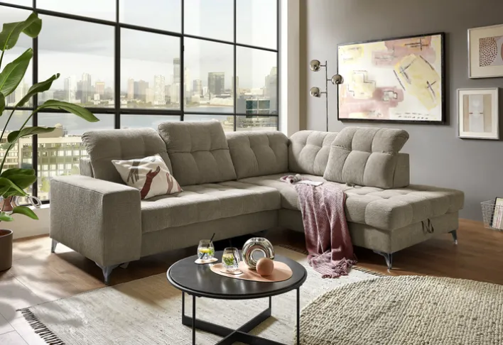 Das Ecksofa „Kaylan“ bietet eine perfekte Kombination aus Komfort und Funktionalität. Mit einer Breite von 289 cm und einer Tiefe von 220 cm passt es ideal in größere Wohnräume. Die Hauptfarbe Beige, im Farbton Sand, verleiht dem Sofa eine warme und einladende Ausstrahlung, die sich harmonisch in verschiedene Einrichtungsstile einfügt. Der Bezug aus 100 % Polyester sorgt für eine angenehme Haptik und Langlebigkeit.
