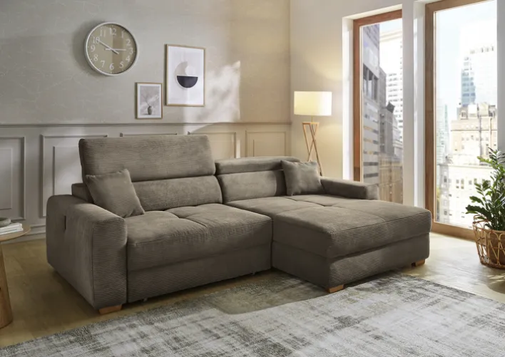 Das Ecksofa aus der Serie ARMANI zeichnet sich durch seine großzügigen Maße von 277 x 187 cm und eine Liegefläche von 134 x 225 cm aus. Die Hauptfarbe ist Taupe, eine elegante Braunnuance, die sich harmonisch in verschiedenste Wohnräume einfügt. Der Cordbezug aus 100 % Polyester überzeugt mit einer gut sichtbaren, weichen Rippenstruktur, die dem Sofa eine moderne und zugleich einladende Ausstrahlung verleiht. Die Oberfläche wirkt durch die markante Textur wohnlich und pflegeleicht. Die Polsterung basiert auf Nosagfederung in Kombination mit Polyätherschaum, was für angenehmen Sitzkomfort sorgt. Das Sofa verfügt über eine Sitzhöhe von 46 cm und eine variable Sitztiefe von 74 bis 134 cm. Die Kopfstützen sind individuell verstellbar und bieten zusätzlichen Komfort. Ein Motor unterstützt die motorische Verstellung bestimmter Funktionen, während auch manuelle Anpassungen möglich sind. Die Schlaf- und Bettfunktion macht das Sofa vielseitig nutzbar. Das Modell ist beidseitig montierbar, wodurch es sich flexibel in verschiedene Raumkonzepte integrieren lässt. Zwei Zierkissen sind im Lieferumfang enthalten. Das stabile Gestell besteht aus Eichenholz, wodurch ein Gewicht von 181 kg erreicht wird. Geeignet ist das Ecksofa insbesondere für den Wohnbereich.