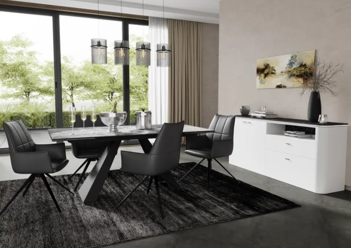 Besonders praktisch ist die Ausziehfunktion, die den Tisch auf eine maximale Länge von 260 cm erweitert. So passt er sich flexibel an unterschiedliche Anlässe an. Die Kombination aus hochwertigen Materialien wie Metall und Keramik macht den Tisch robust und langlebig. Der Esstisch TURIN ist die ideale Wahl für alle, die Wert auf Design und Funktionalität legen.