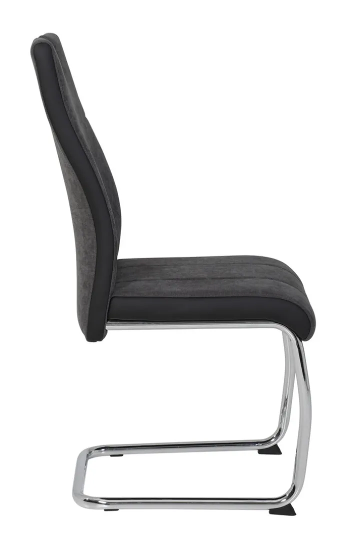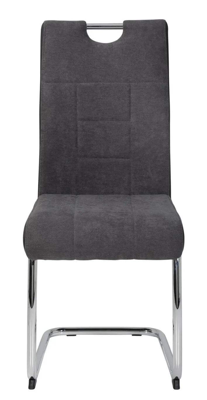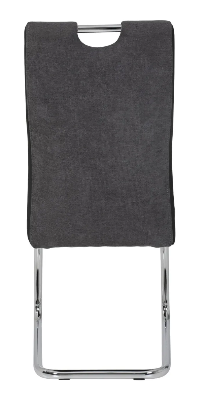 Das Formdesign des Esszimmerstuhls ALINA ist von Geradlinigkeit und zeitloser Eleganz geprägt: Dafür sorgt nicht zuletzt die Form der Rückenlehne, welche die Linienführung des Schwinggestells aufgreift. Letzteres besteht aus hohlen Metallrohren, die mit ihren verchromten Oberflächen für einen glänzenden Kontrast zum schlichten Webstoffbezug in Anthrazit sorgen. Die ästhetischen Raffinessen dieses Stuhlmodells stecken aber in den Details: So werden optische Akzente wie die dezenten Steppnähte durch Applikationen aus Kunstleder an den Seiten von Sitzfläche und Rückenlehne ergänzt. Insgesamt präsentiert sich der Esszimmerstuhl ALINA als zeitloses Einrichtungselement mit stilsicherem Designkonzept.