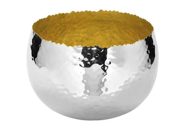 Die elegante Fink Dekoschale SEFA ist von Hand gefertigt und besteht aus vernickeltem Metall mit einer ausdrucksstarken gehämmerten Oberfläche. Während die Außenseite in edler Silberfarbe gehalten ist, erstrahlt die Innenseite ganz in Goldfarbig. Durch die außergewöhnliche Hammeroberfläche und die unregelmäßige Form strahlt jede Dekoschale einen individuellen Charme aus. Die Schale lässt sich mit Nüssen, Obst oder Dekorationsgegenständen füllen und harmoniert durch ihr stilvolles Design mit praktisch jedem Einrichtungsstil. Erhältlich ist die Schale in verschiedenen Größen, die sich miteinander kombinieren lassen.
