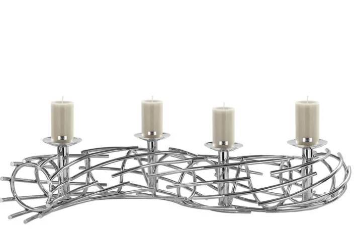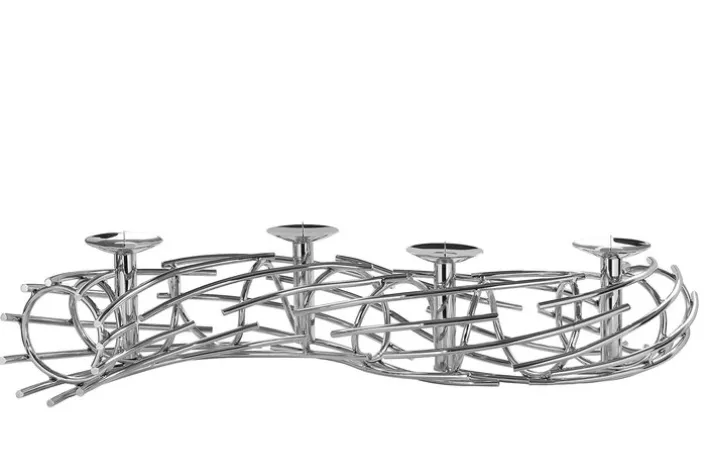 Mit seiner geschwungenen Form ist er insgesamt 80 cm lang und strahlt mit seinen silberfarbig vernickelten Oberflächen nüchterne Eleganz aus. Der Kerzenhalter kann aber längst nicht nur in der Weihnachtszeit Verwendung finden. Da die interessant aus dünnen Metallstäben zusammengesetzte Form keinen spezifischen Weihnachts- oder Winterbezug hat, kann der Kerzenhalter durchaus ganzjährig genutzt und durch verschiedene Arten von Dekoration ergänzt werden.