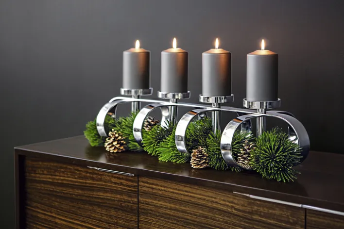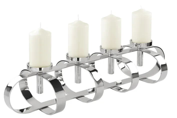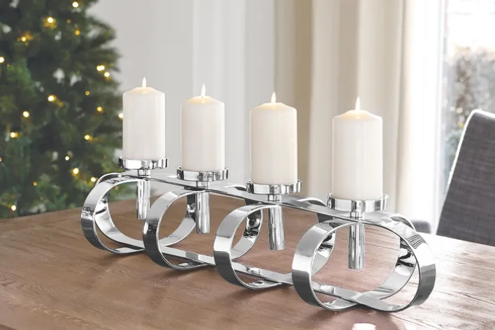 Die vier Halterungen für die Kerzen sitzen auf einem sie verbindenden Metallband, das an beiden Seiten jeweils in einem Außenbogen nach unten geführt wird und hier ein Parallelband bildet. Außerdem sind unter jeder Halterung weitere Bögen quer zu diesen Bändern angebracht, sodass sich eine luftig-leichte und doch sehr stabile Konstruktion ergibt. Der FINK Kerzenhalter GORDON ist anlaufgeschützt und behält damit seine schöne Farbe. In den vier Halterungen haben ebenso viele Stumpenkerzen Platz. Dabei können Sie die Farbe nach Belieben wählen, denn das silberfarbige Metall passt zu jeder Variante, ob Sie Rot, Weiß, Creme, Blau oder Silber bevorzugen. Mit seiner Länge von 85 cm braucht der Halter etwas Platz, beispielsweise auf dem Couchtisch oder auf einem Sideboard/Lowboard. Er kann auch auf dem Esstisch stehen und jede Mahlzeit zu einem festlichen Event gestalten. Der FINK Kerzenhalter GORDON ist für Innenräume gedacht.