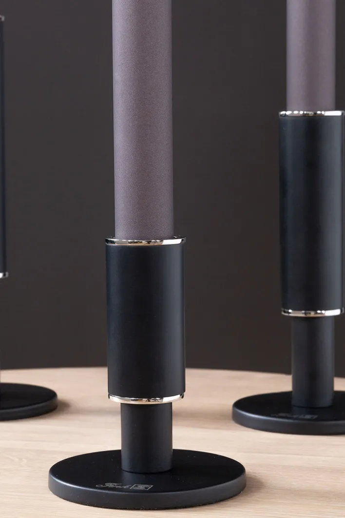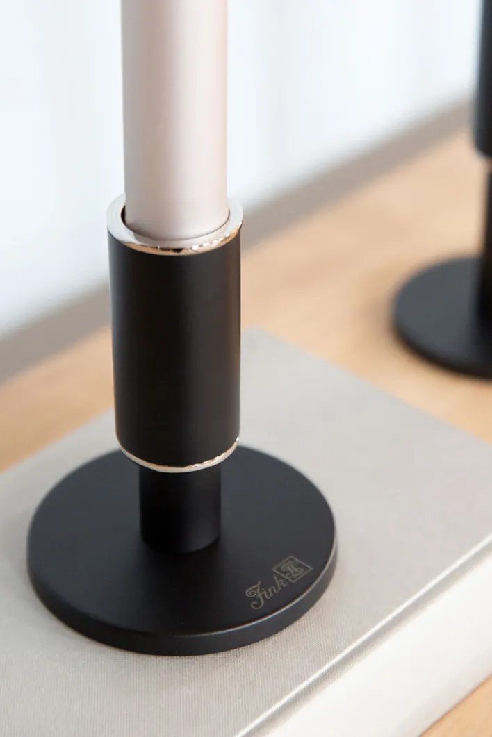 Der Fink Kerzenleuchter RITMO besteht aus matt schwarz pulverbeschichtetem Metall und ist für Stabkerzen geeignet. Silberfarbige, vernickelte Absetzungen unterstreichen das moderne, stilvolle Design des Kerzenständers. Der Kerzenleuchter hat eine Höhe von 11,7 cm und der Sockel mit 10 cm Durchmesser verleiht ihm einen hervorragenden Stand. Durch seinen eleganten Look lässt er sich zu jeder Jahreszeit verwenden. Verpackt in einer edlen schwarzen Schachtel macht dieser Kerzenhalter auch als Geschenk eine fantastische Figur.