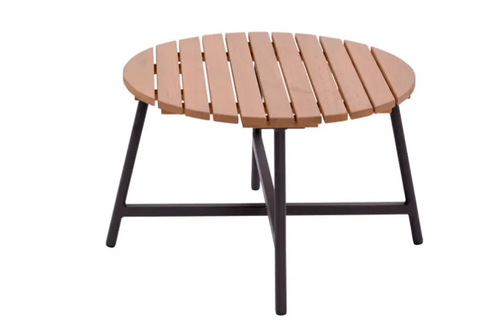 Das Gestell des Tisches besteht aus Aluminium in der Farbe Grau. Die funde geformte Tischfläche in lamellenoptik ist aus FSC recyceltem Teakholz gemacht und somit besonders nachhaltig produziert.