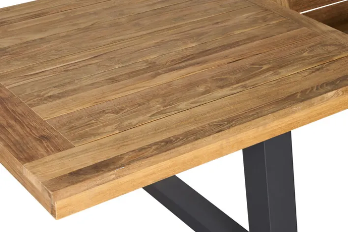 Der große Gartentisch OLI von Garden FLAIR hat die Maße 220 x 100 cm und präsentiert sich elegant in einem zeitlosen Design. Durch die wunderschöne Tischplatte aus Teak und das A-Gestell im Farbton Sandschwarz fällt der rechteckige Tisch sofort ins Auge und ist leicht mit verschiedenen Gartenstühlen kombinierbar. Ausgestattet mit einem Auszug, ist der Tisch auf 300 cm verlängerbar und bietet Platz für 8 bis 10 Personen. Der schöne Gartentisch für den Innen- und Außenbereich schafft auf der Terrasse oder im Garten eine angenehme Atmosphäre.