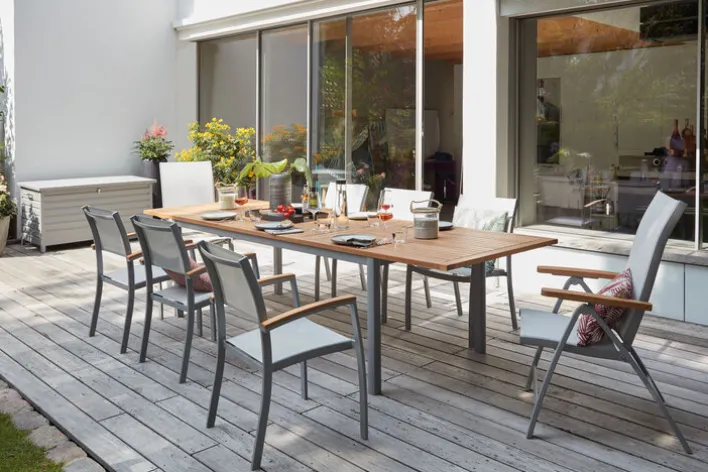 Farbe: GrauMaterial: HolzMetallOberflächenbeschichtung: pulverbeschichtetGestellart: VierfußgestellHolzart: EukalyptusholzHolzqualität: massivMetallart: Aluminium