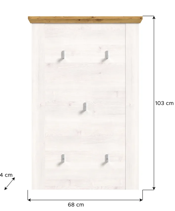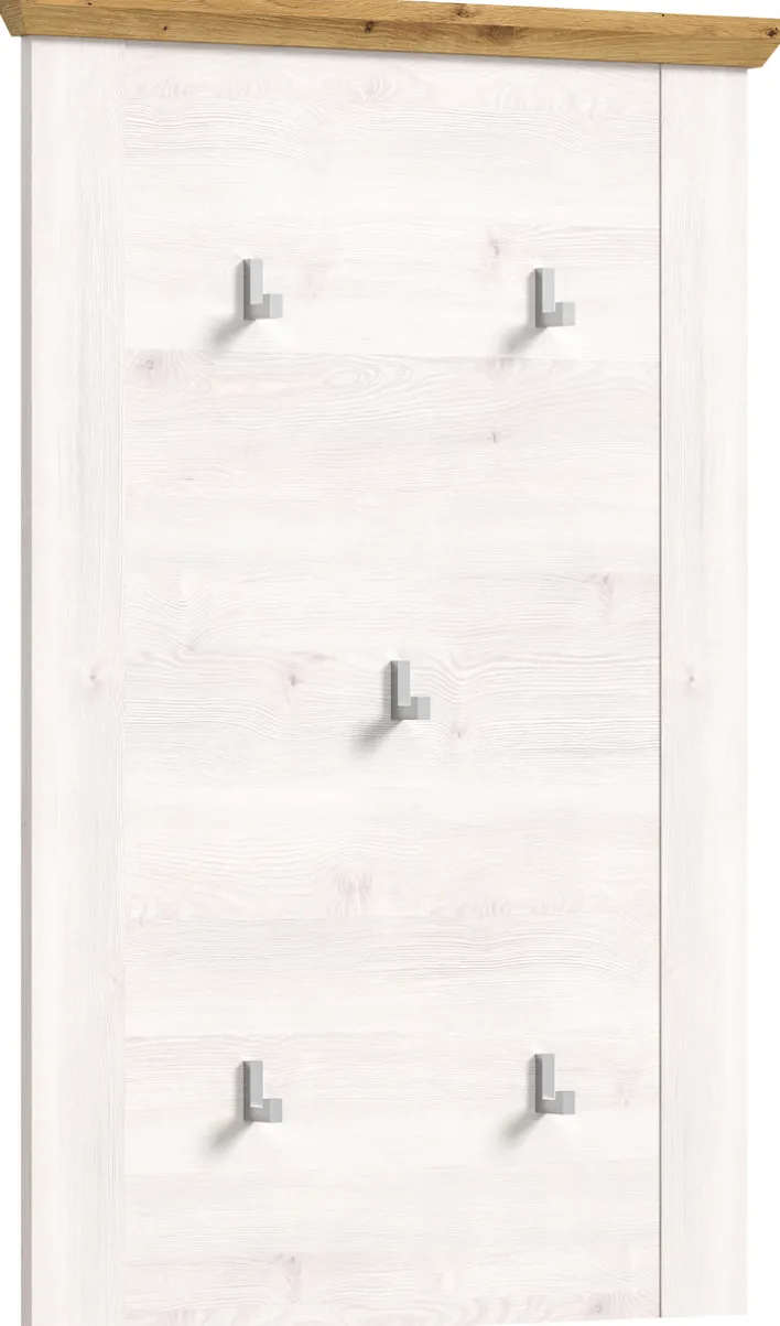 Das 64 x 103 x 4 cm große Garderobenpaneel VERONA verbindet weiße und braune Farbtöne. Dank der Ausstattung mit praktischen Kleiderhaken eignet sich dieses Modell hervorragend für die Gestaltung des Eingangsbereichs.